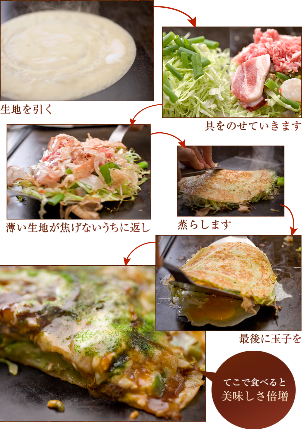 ゴロンとした貝柱、旨みたっぷりの厚切り豚バラとロース、広島のかき、味わいのあるイカ、ぷりぷりのえび、それら極上の具材に負けないキャベツと山芋の自然の甘みに日夜「感動のお声」頂いてます。